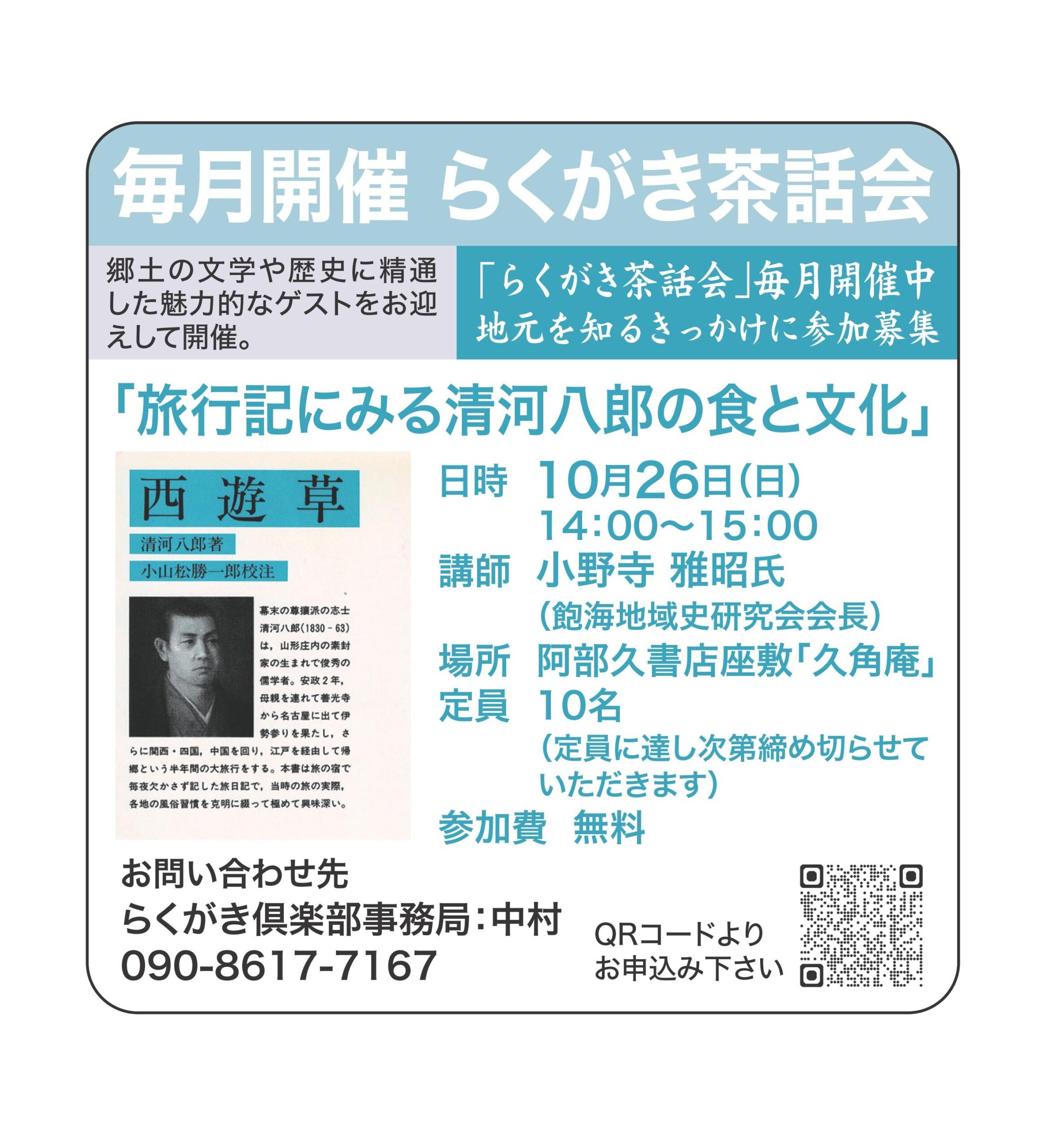 今月のらくがき茶話会は清河八郎の旅行記などからどの様な食事をしていたかを考察している飽海地域史研究会の小野寺先生のお話となります。